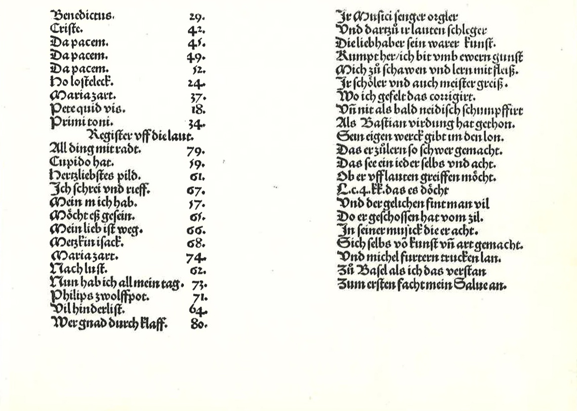 4v: index of the songs (left column); poem on music printing, criticising Virdung and his printer Furter in Basel (right column).