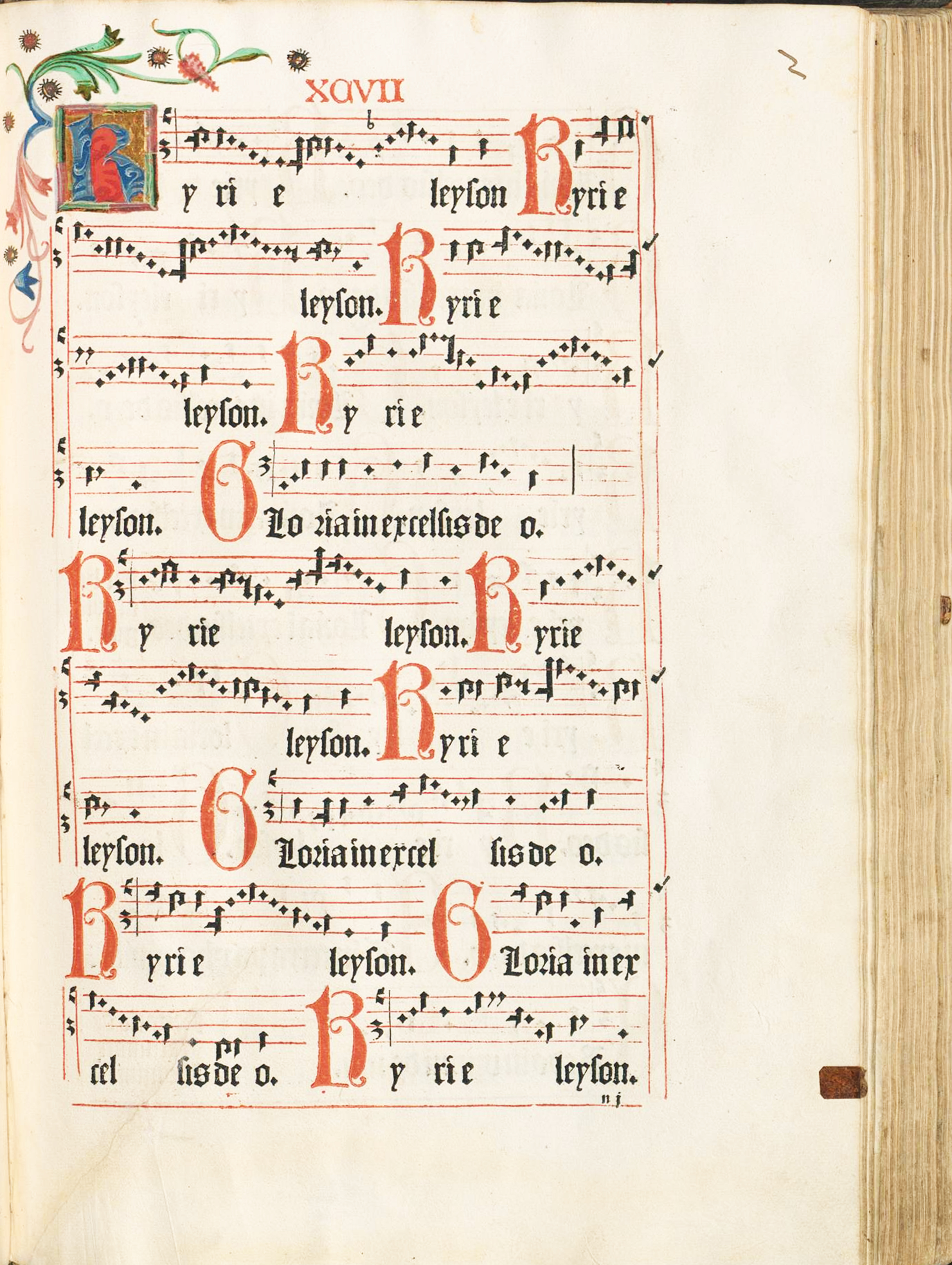 red type on title page, red staff lines, red initials, red text