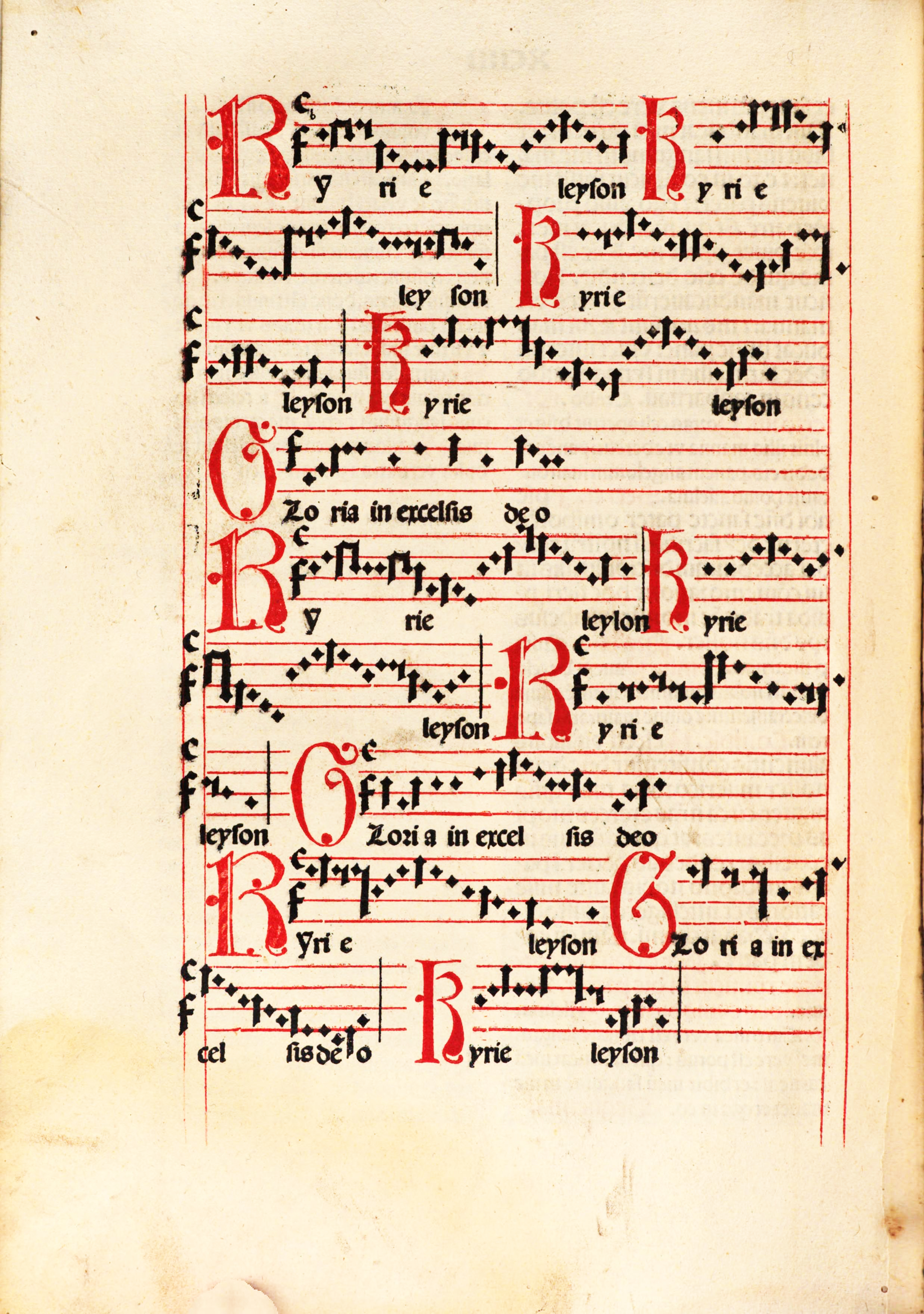 Black Hufnagelschrift on red four-line staves on m6 and through quires n and o. Ratdolt often gives f- and c-clefs on the same staff.