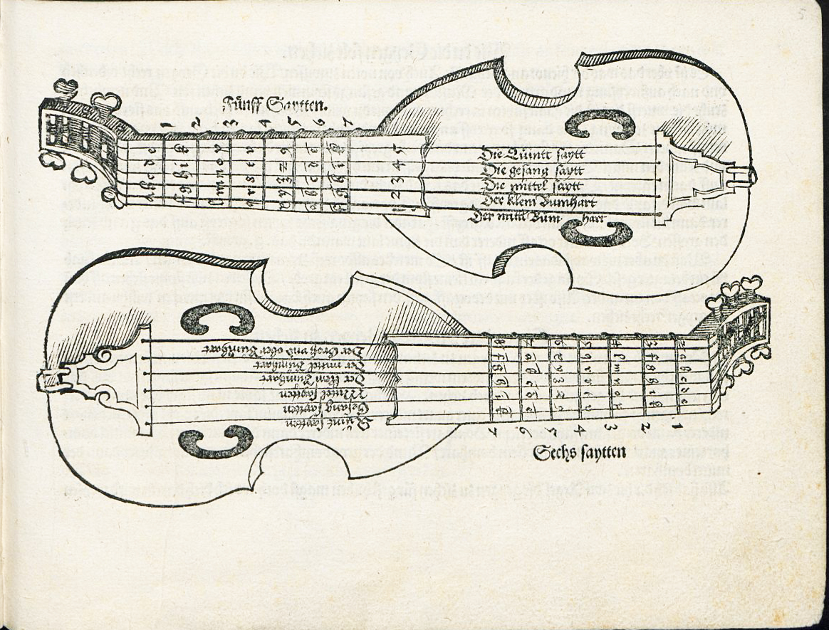 A4r: woodcut of two five-stringed Geygen (without bridges) with labels for each string.