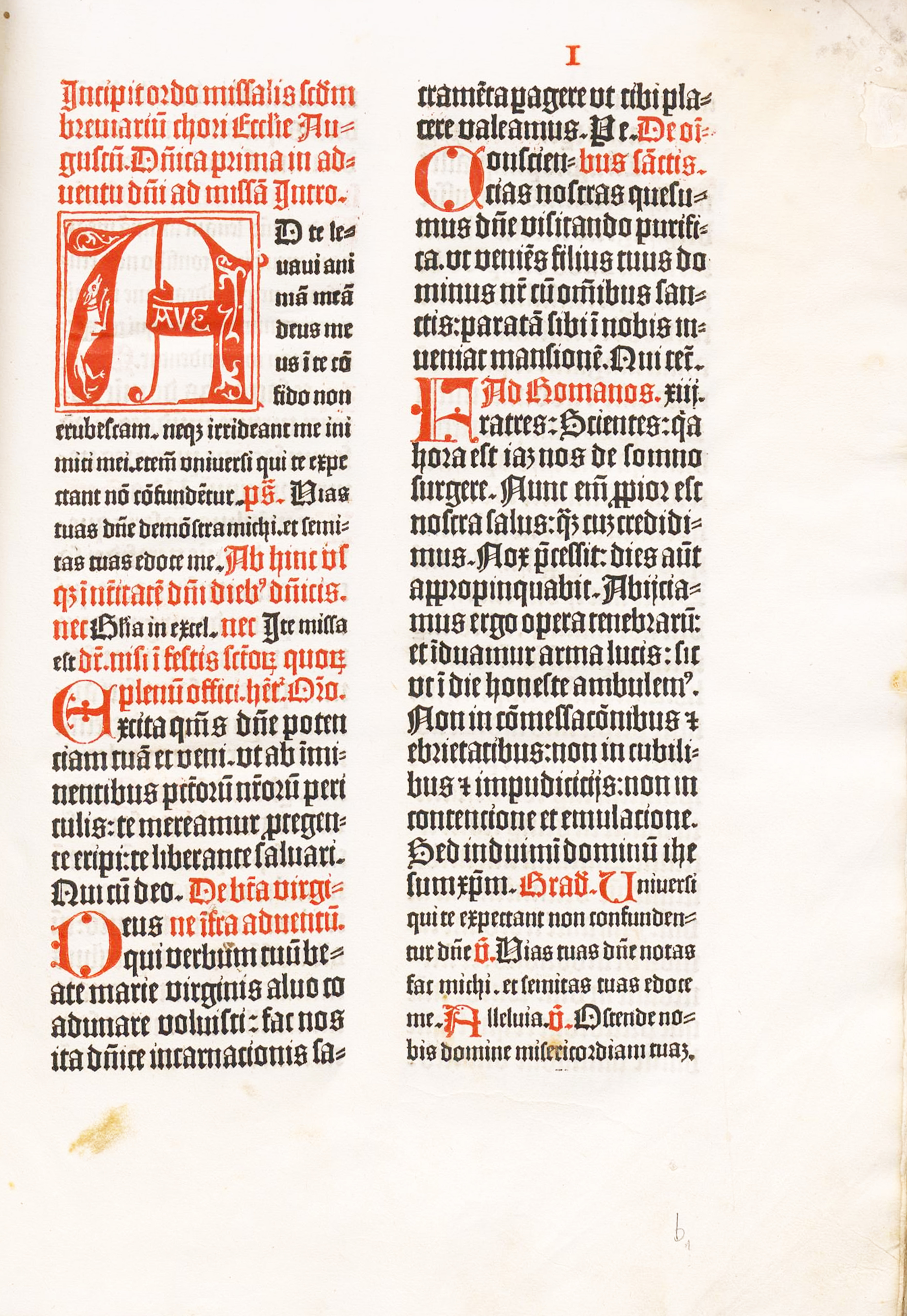 [fol. 1r:] Incipit ordo missalis scd'm || breuiariū chori Eccl'ie Au⸗||gustū.Dñica prima in ad⸗||uentu dñi ad missā Intro.||