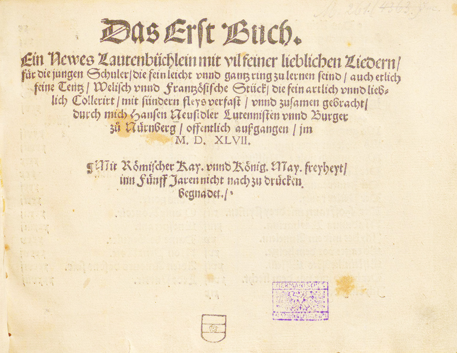 Das Erst Buch.|| Ein Newes Lautenbüchlein mit vil feiner lieblichen Liedern/|| für die jungen Schuler/ die fein leicht vnnd gantz ring zu lernen seind / auch etlich || feine Tentz / Welisch vnnd Frantzösische Stück/ die fein artlich vnnd lieb⸗||lich Collerirt/ mit sündern fleys verfast / vnnd zusamen gebracht/|| durch mich Hansen Neusidler Lutennisten vnnd Burger || zů Nürnberg / offentlich außgangen / jm || M. D. XLVII.|| ¶ Mit Römischer Kay. vnnd König. May. freyheyt/|| inn Fünff Jaren nicht nach zu drücken || begnadet./.||