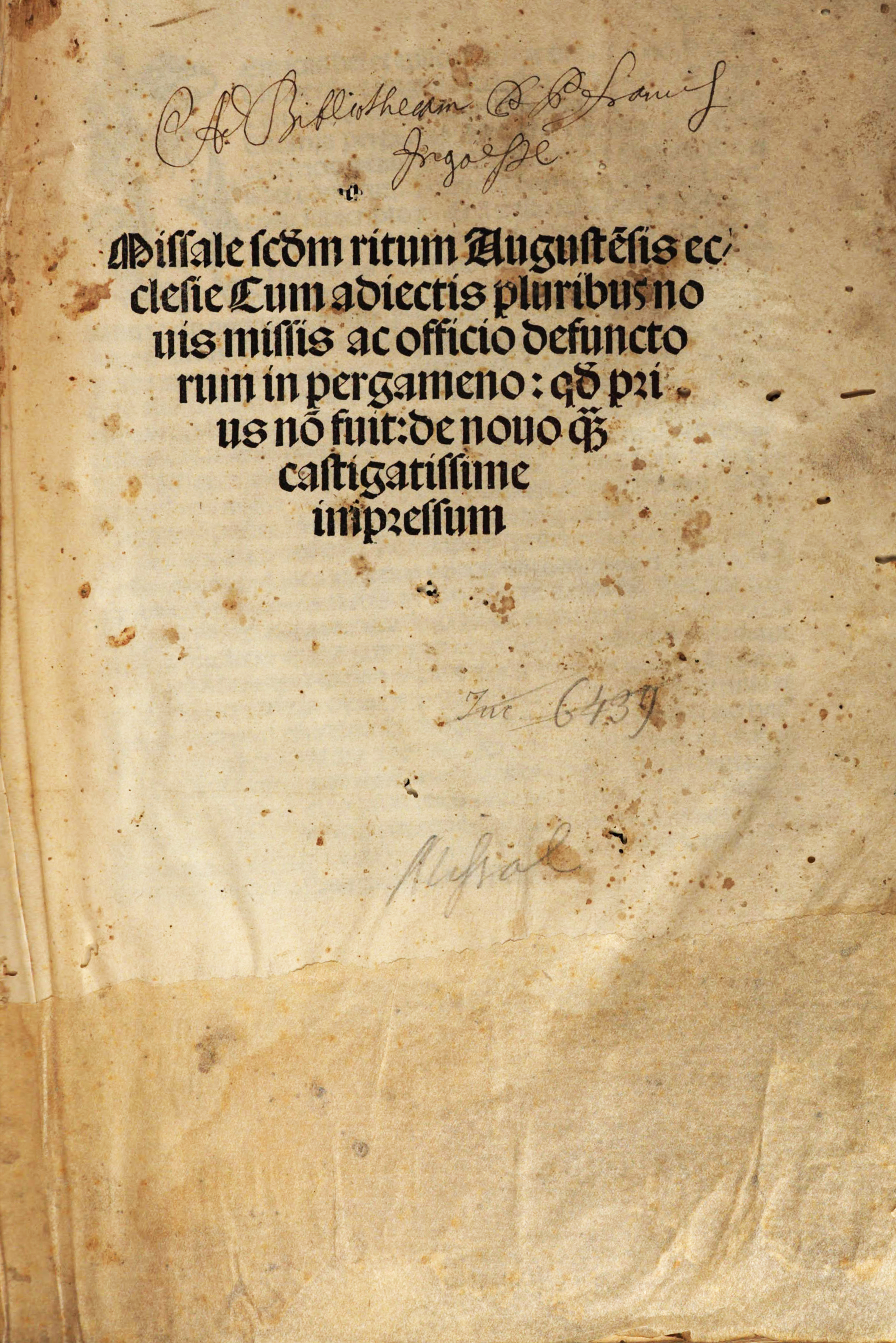 Missale scđm ritum Augustẽsis ec-||clesie Cum adiectis pluribus no||uis missis ac officio defuncto||rum in pergameno : qđ pri||us nõ fuit:de nouo q̃𝔷 || castigatissime || impressum ||
