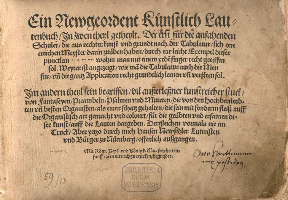 Ein Newgeordent Künstlich Lau⸗||tenbuch/ In zwen theyl getheylt. Der erst für die anfahenden || Schuler/ die aus rechter kunst vnd grundt nach der Tabulatur/ sich one || einichen Meyster darin zuüben haben durch ein leicht Exempel dieser || punctlein . .. ... .... wohin man mit einem yedē finger recht greiffen || sol. Weyter ist angezeigt/ wie mā die Tabulatur auch die Men||sur/ uñ die gantz Application recht grundtlich lernen vñ versteen sol.|| Im andern theyl sein begriffen/ vil außerleßner kunstreicher stuck/|| von Fantaseyen/ Preambeln/ Psalmen vnd Muteten/ die von den hochberümb⸗||ten vñ besten Organisten/ als ein schatz gehalten/ die sein mit sonderm fleiß auff || die Organistisch art gemacht vnd colorirt/ für die geübten vnd erfarnen di⸗||ser kunst/ auff die Lauten dargeben. Dergleichen vormals nie im || Truck/ Aber yetzo durch mich Hansen Newsidler Lutinisten || vnd Bürger zu Nürnberg/ offenlich außgangen.|| Mit Röm. Keys. vnd Königk. Ma. freyheit/ in || funff iaren nit nach zu trucken/ begnadet.||