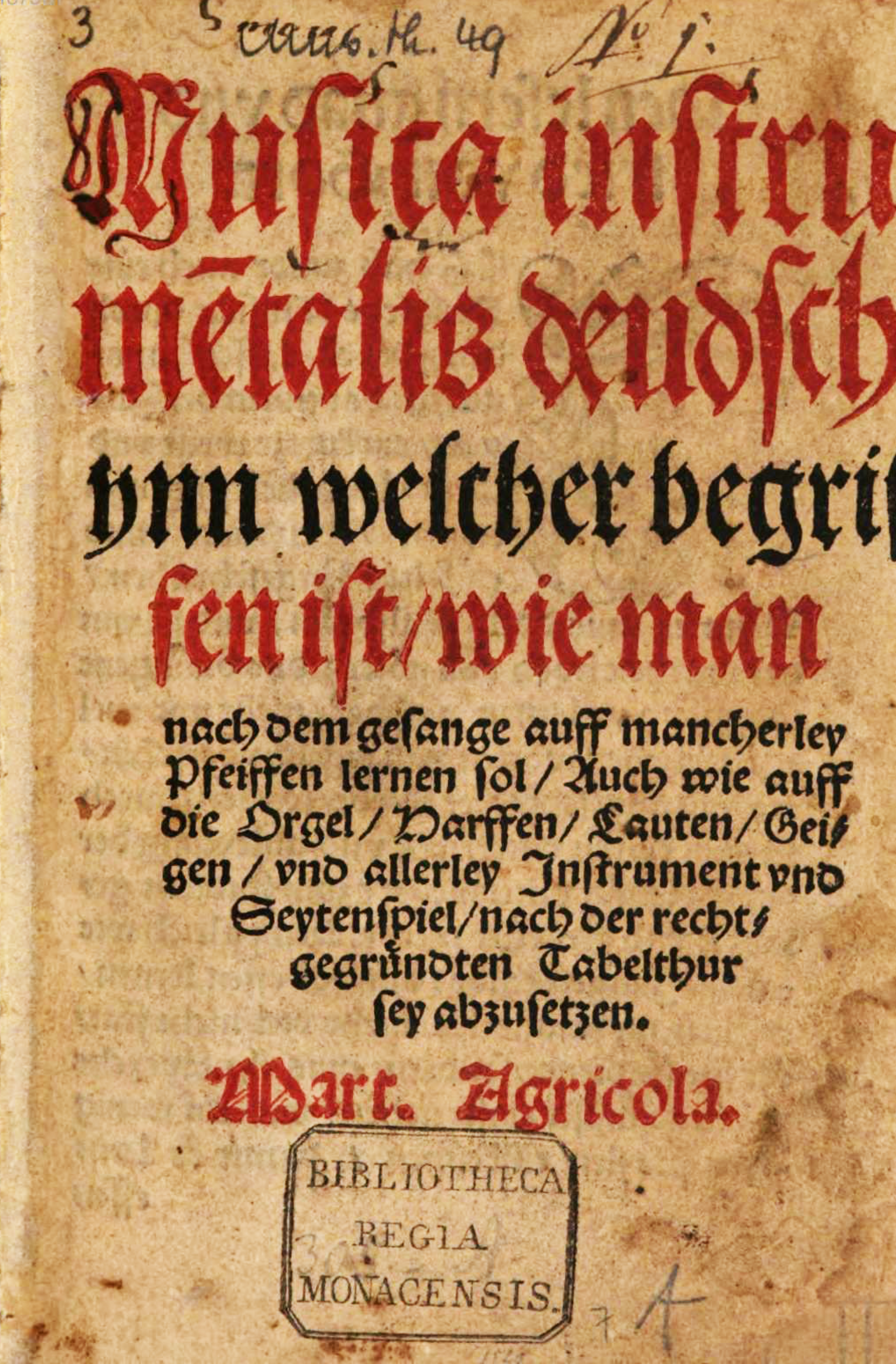 Musica instru⸗||mÄ“talis deudsch || ynn welcher begrif⸗||fen ist/wie man || nach dem gesange auff mancherley || Pfeiffen lernen sol/ Auch wie auff || die Orgel/ Harffen/ Lauten/ Gei⸗||gen/ vnd allerley Instrument vnd || Seytenspiel/nach der recht⸗||gegründten Tabelthur || sey abzusetzen.|| Mart. Agricola.||