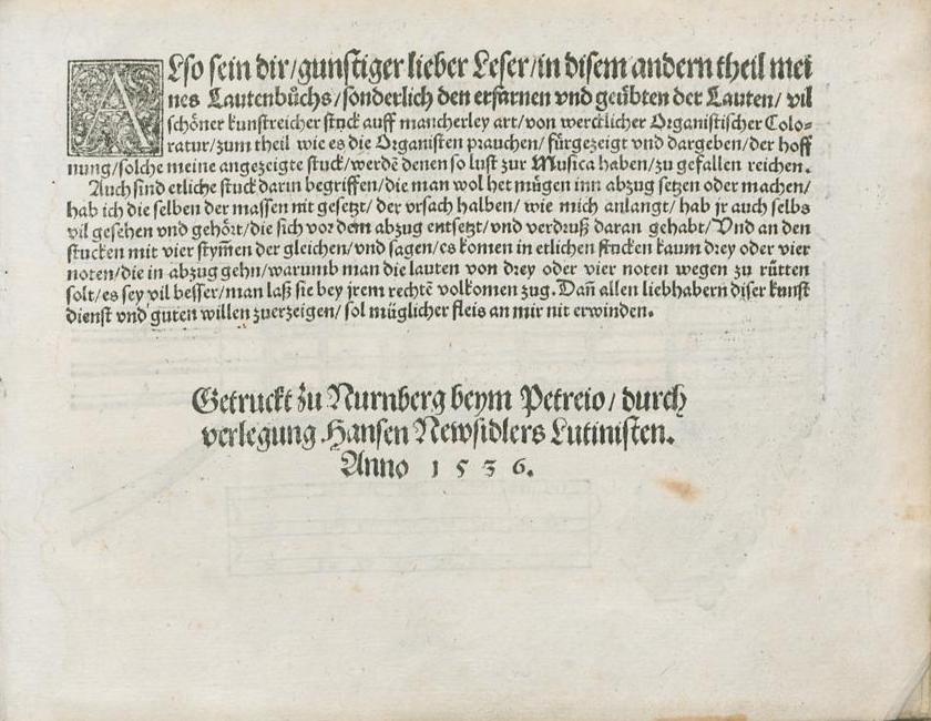 Der ander theil des Lautenbůchs.|| Darin sind begriffen/ vil außerlesner kunstreycher stuck/ von Fanta⸗||seyen/ Preambeln/ Psalmen vnd Muteten/ die von den hochberümbten vnd besten || Organisten/ als einen schatz gehalten/ die sein mit sonderm fleyß auff die Orga⸗||nistisch art gemacht vnd coloriert/ für die geübten vnnd erfarnen di⸗||ser kunst/ auff die Lauten dargeben. Dergleichen vormals nie im || Truck/ aber yetzo durch mich Hansen Newsidler Lutinisten || vnd Bürger zu Nürnberg/ offenlich außgangen.|| Mit Röm. Keys. vnd Königk. Ma. freyheit/ in || funff jarn nit nachzutrucken/ begnadet.||