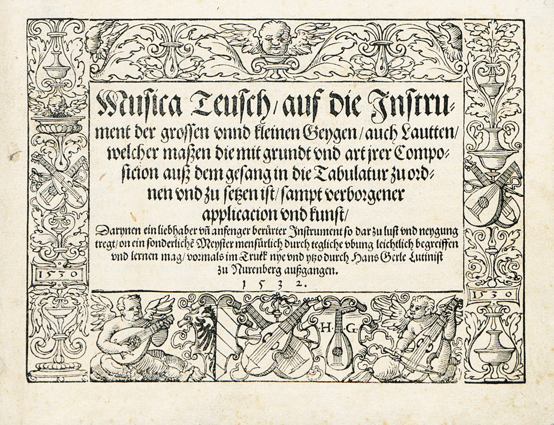 Musica Teusch/ auf die Instru=||ment der grossen vnnd kleinen Geygen/ auch Lautten/|| welcher maßen die mit grundt vnd art jrer Compo=||sicion auß dem gesang in die Tabulatur zu ord=||nen vnd zu setzen ist/ sampt verborgener || applicacion vnd kunst/|| Darynen ein liebhaber uñ anfenger berürter Instrument so dar zu lust und neygung || tregt/ on ein sonderlichÄ“ Meyster mensürlich durch tegliche ubung leichtlich begreiffen || vnd lernen mag/ vormals im Truck nye vnd ytzo durch Hans Gerle Lutinist || zu Nurenberg außgangen.|| 1532.||