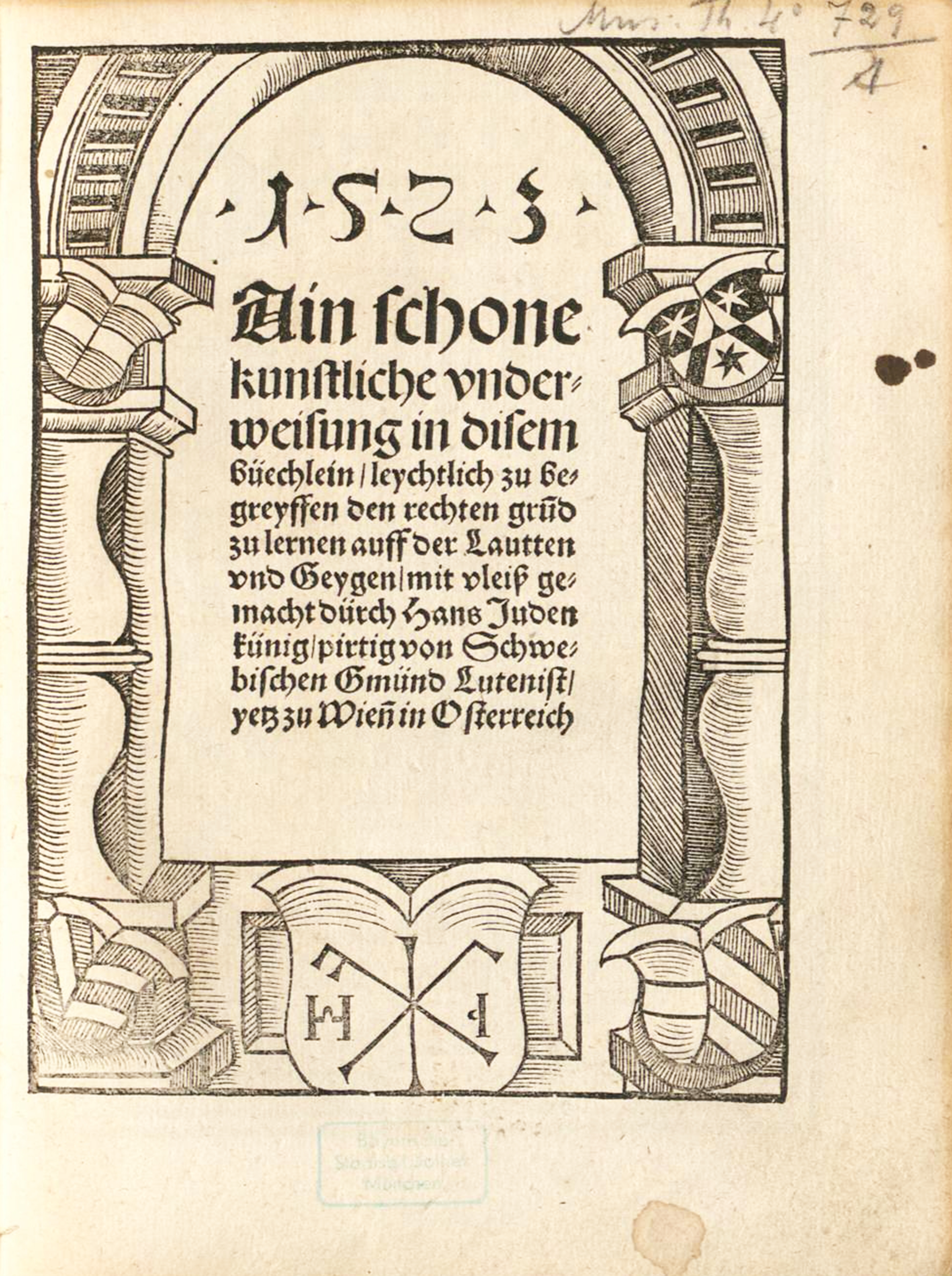 .1.5.2.3.|| Ain schone || kunstliche vnder=||weisung in disem || büechlein / leychtlich zu be⸗||greyffen den rechten grÅ«d || zu lernen auff der Lautten || vnd Geygen / mit vleiß ge⸗||macht dürch Hans Juden||künig / pirtig von Schwebischen Gmünd Lutenist /|| yetz zu Wieñ in Osterreich.||